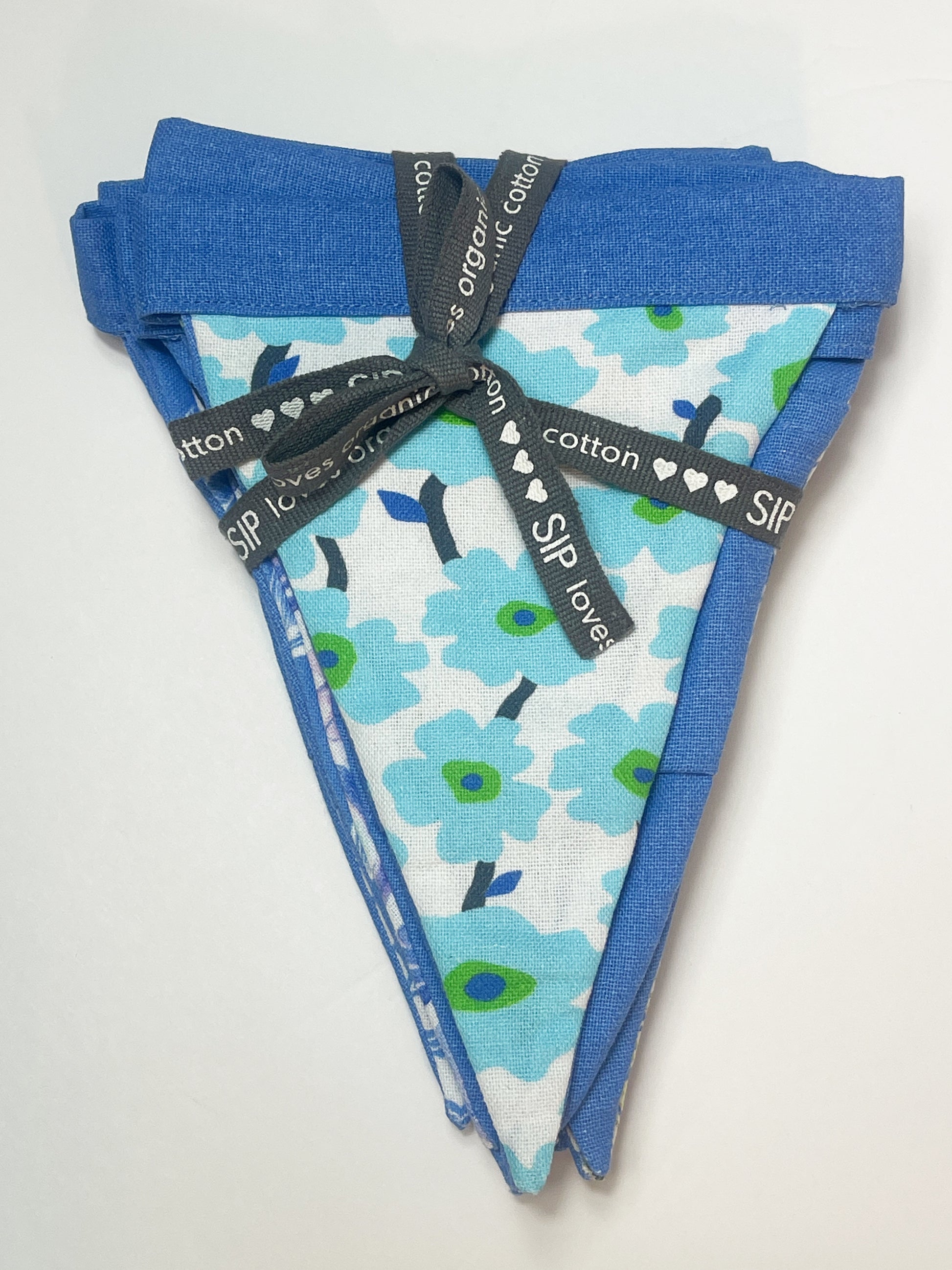 These are beautiful made with organic cotton. The triangles are 8" tall and 6" at the top.