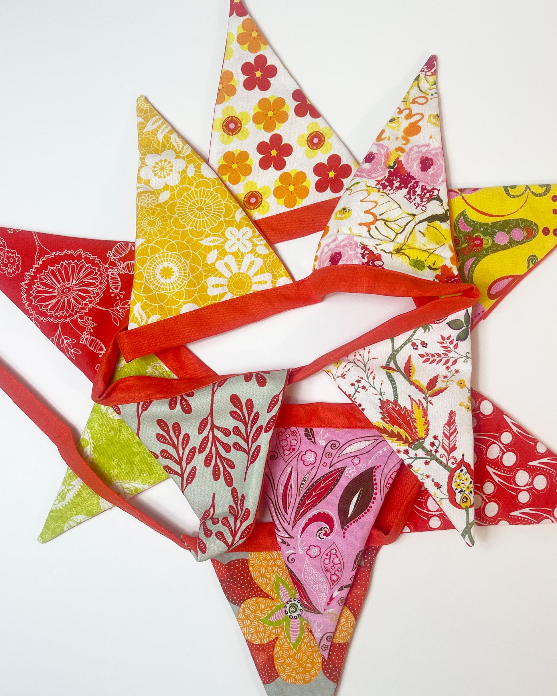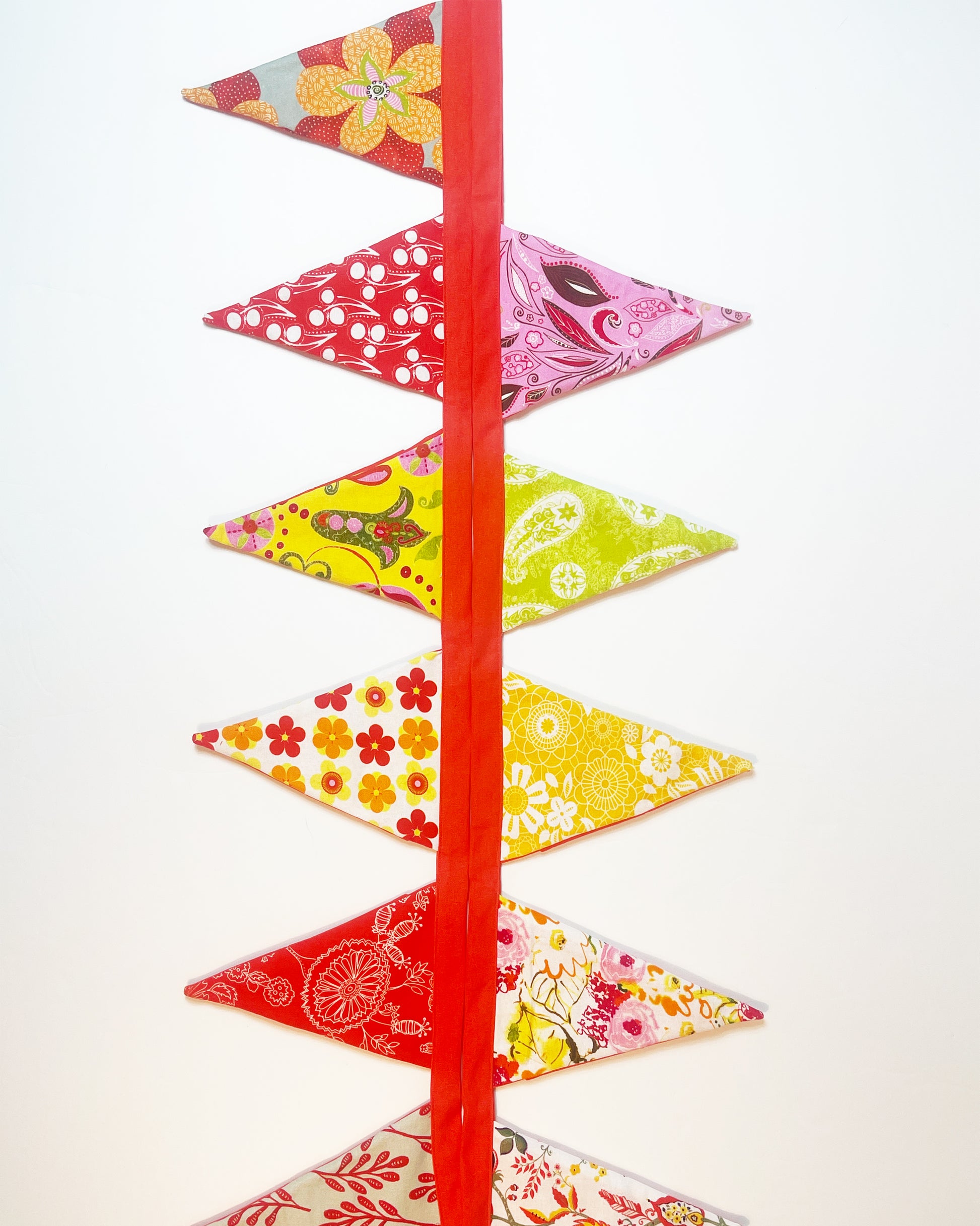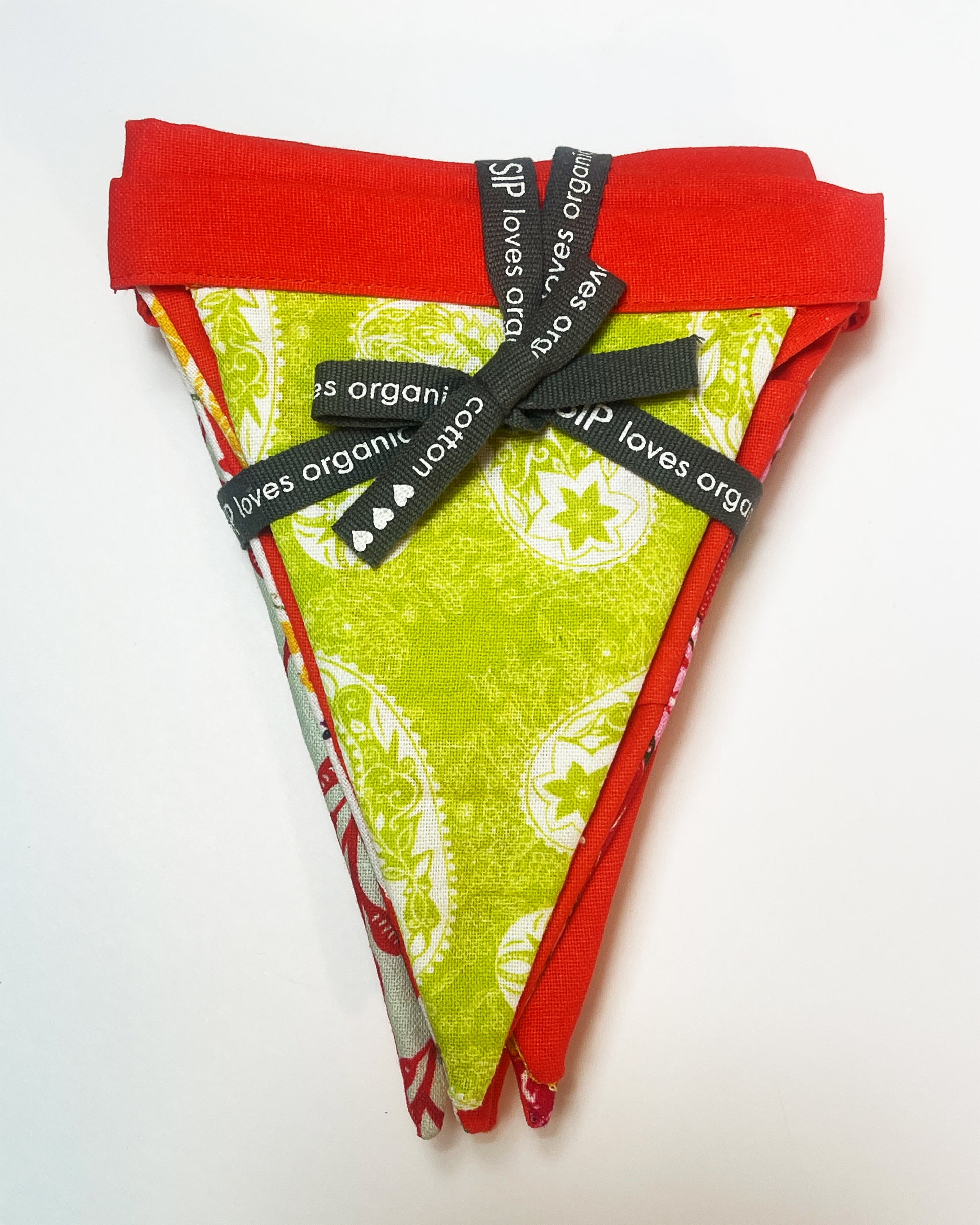 These are beautiful made with organic cotton. The triangles are 8" tall and 6" at the top.